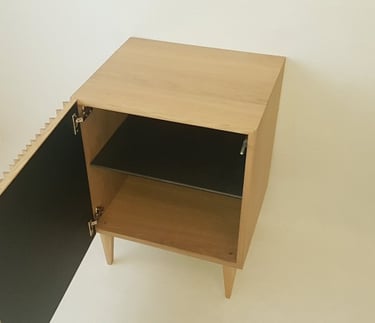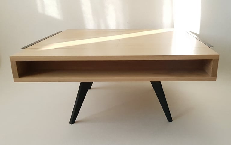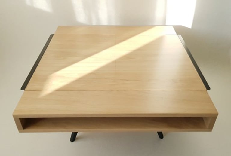 Modularité Surprenante : Ce qui rend cette table unique est son système de plateau coulissant. Les deux sections de "pixels" s'écartent latéralement pour révéler un vaste espace de rangement central, idéal pour stocker des objets tout en conservant une surface nette.