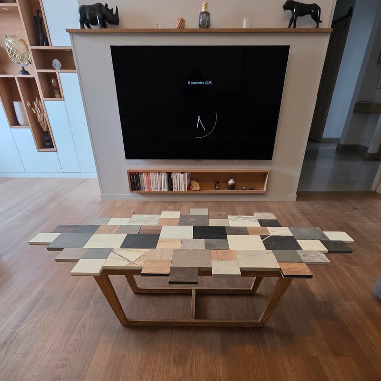 La table Pixel porte parfaitement son nom. Son plateau est composé d'une multitude de carrés de différentes matières et textures (bois, marbre, pierre, teintes minérales) qui rappellent les pixels d'une image numérique haute définition.